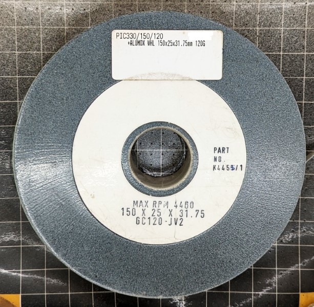 Aluminium oxide grinding wheel. 6in x 1in x 1.1/4in. 150x25x31.75mm. 120 Grit. Maximum speed 4460 RPM.