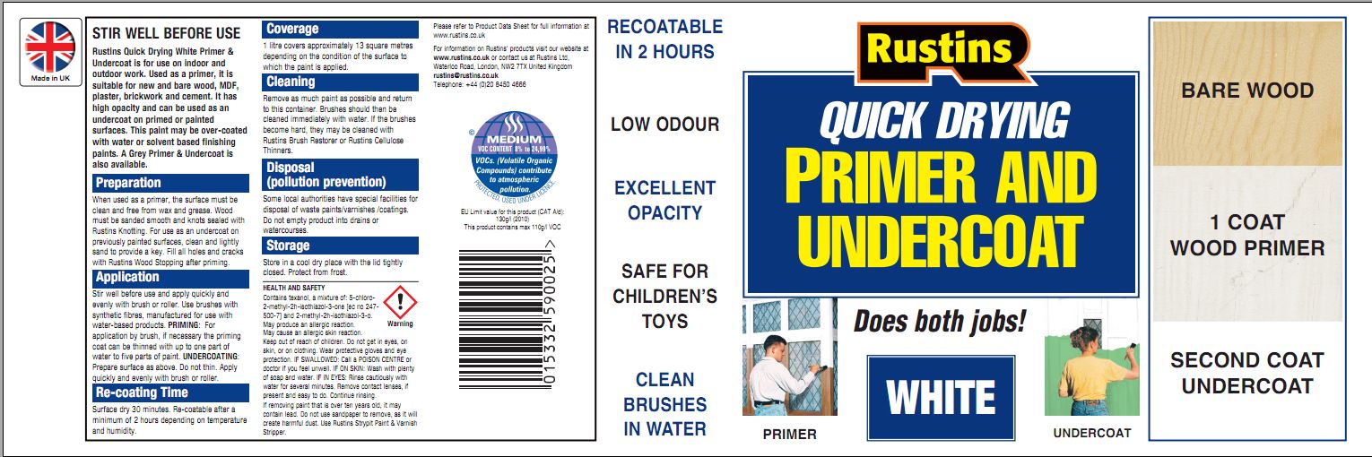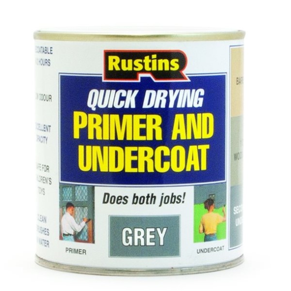 Rustinยs Quick Drying Primer and Undercoat is for use on interior and exterior work. Used as a primer, it is suitable for new and bare wood, MDF, plaster, brickwork and cement. It has high opacity and can be used as an undercoat on primed or painted surfaces. This paint may be overcoated with water or solvent based finishing paints. Clean brushes in water.