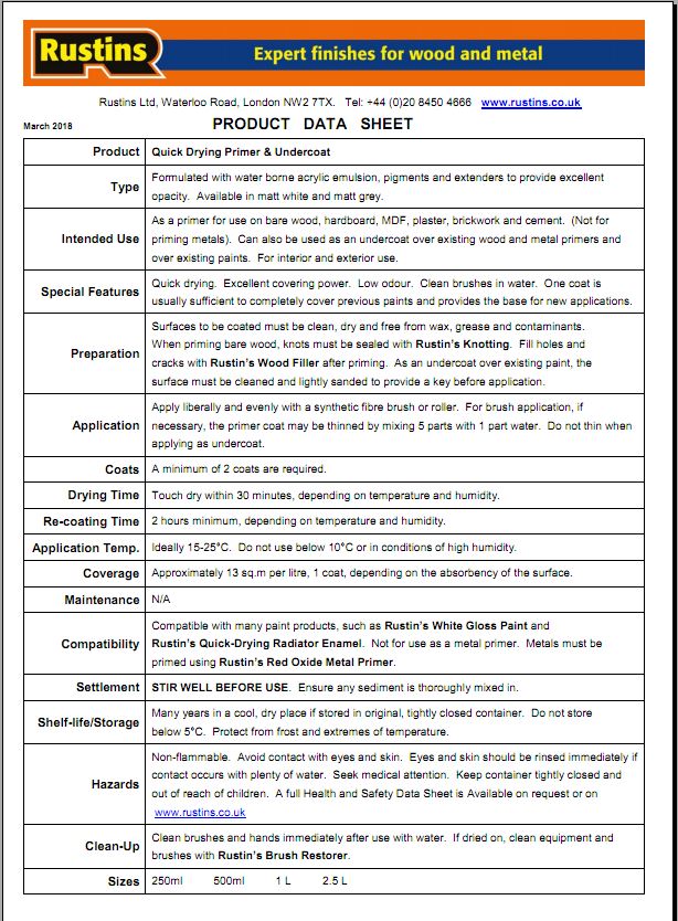 Rustinยs Quick Drying Primer and Undercoat is for use on interior and exterior work. Used as a primer, it is suitable for new and bare wood, MDF, plaster, brickwork and cement. It has high opacity and can be used as an undercoat on primed or painted surfaces. This paint may be overcoated with water or solvent based finishing paints. Clean brushes in water.