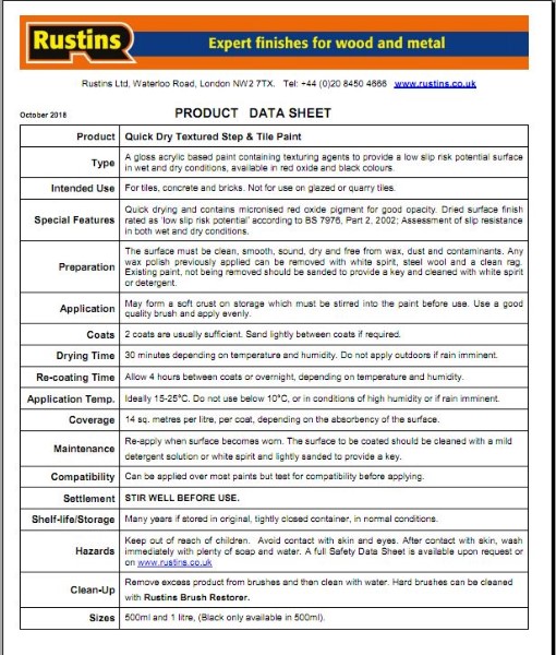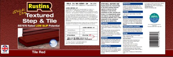Rustins Quick Dry Textured Step & Tile Paint A quick dry paint that contains textured agents to improve the slip resistance in wet and dry conditions on tiles, concrete and bricks. It is independently tested and rated as low slip potential according to BS7976, Part 2, 2002 assesment of slip resistance.