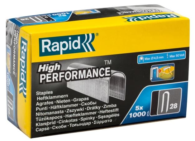 Rapid No. 28 precision cut, high performance steel flat wire cable staples with rounded crown are designed for securing low voltage cables up to a maximum of 4.5mm in diameter. They are made from high performance strong galvanised wire with diverging points (DP), which makes leg points go in opposite directions for extra strong bonding.