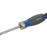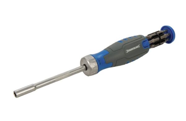 Allows access to obscure and confined fixings. 3-position ratchet action, 1/4in magnetic drive sockets and soft-grip driver handle for firm control. Forward, reverse and locked positions. Bits are cleverly stored in the rotating handle. Includes slotted: 3, 4, 5 and 6mm, PZ: PZ0, PZ1, PZ2 and PZ3, Trx: T10, T15, T20 and T25.