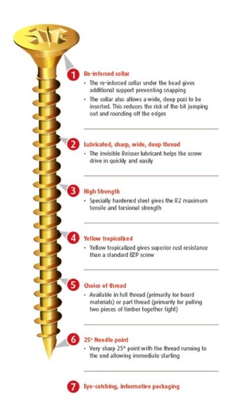 REISSER R2 WOODSCREWS have been trusted for over 30 years to give consistent performance in all timbers and board materials. The 25deg needle point gives the ability to penetrate almost all timbers without a pilot hole and the sharp, wide deep thread with unique lubrication gives up to 40% less driving resistance and easy penetration. Specially hardened steel gives the R2 maximum tensile and torsional strength and the tried and tested R2 thread pattern offers exceptionally high pull out resistance. The Yellow Tropicalized coating gives superior corrosion resistance (compared to a standard BZP coating) and the deep reinforced pozi drive countersunk head recess allows the best possible fit to the driver bit, reducing cam out and providing extra strength at the critical junction between shank and head. Fully accredited the R2 is available if a huge range of sizes, in full and part thread and in many volume options Presented in attractive, informative packaging the R2 WOODSCREW sets the standard for the Consistency of Quality and performance of all products.