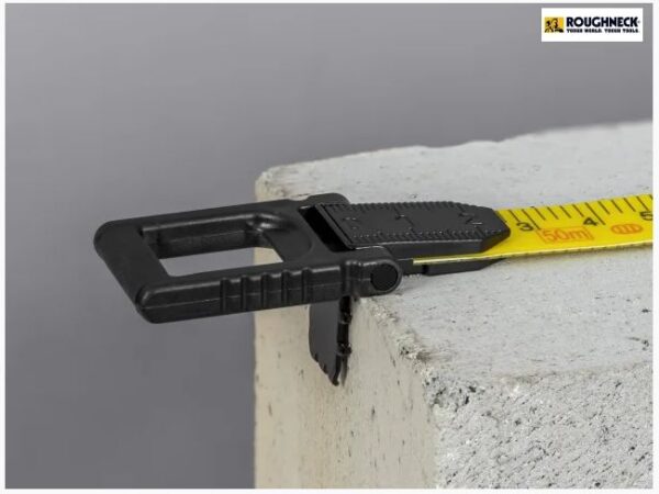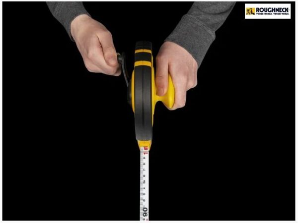 The Roughneck® Closed Long Tape features double-injected ABS housing with tough TPR casing to provide outstanding protection and durability. Wide, easy to read, fibreglass blade with a blade guard coating for protection. Geared mechanism with 3:1 retrieve ratio for fast and smooth blade retraction. Turning up to 1.3m in just 1 rotation, reducing time and effort. Innovative handle drive release mechanism prevents handle rotation when drawing tape. Unique, ergonomic one-hand grip vastly improves handling and comfort.