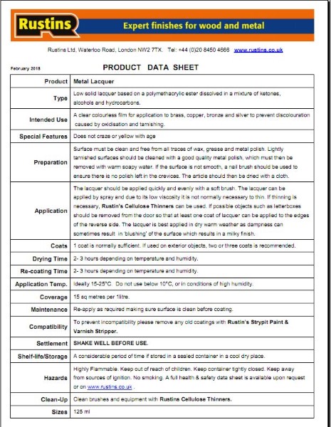 Rustins Metal Lacquer – clear lacquer that leaves a film that does not yellow or craze on ageing. Has excellent adhesion on chrome, brass, copper and silver. No more cleaning