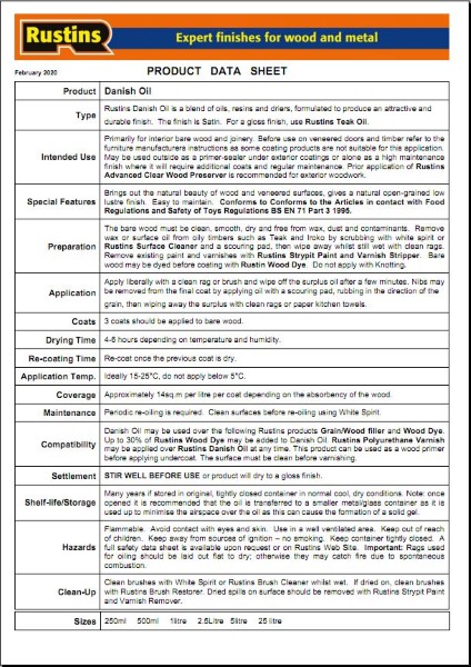 DANISH OIL. An oil finish, suitable for all types of wood. It differs from Teak Oil in that it contains special ingredients, which prevent it drying to a gloss. It is an easy to use wipe on finish, which brings out the beauty of the timber and gives a natural, open grained, soft lustrous finish. Ideal for all woods and is excellent on turned woodwork. Danish Oil is a unique formulation developed by Rustins