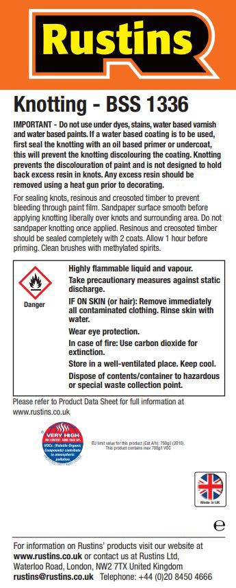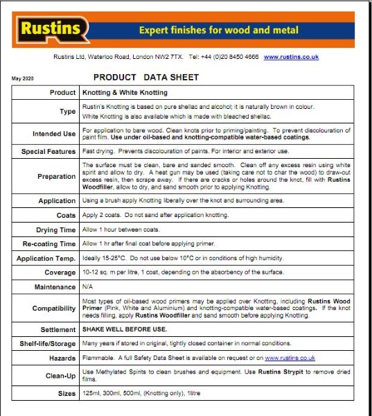 Rustins Knotting for sealing knots, resinous and creosoted timber to prevent bleeding through paint film. Sandpaper surface smooth before applying liberally over knots and surrounding area. Do not sandpaper knotting once applied. Resinous and creosoted timber should be sealed completely with 2 coats. Allow 1 hour to dry before priming. Clean brushes with methylated spirits.