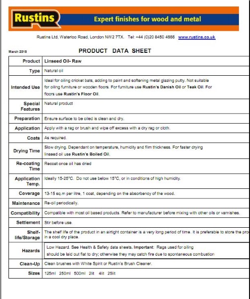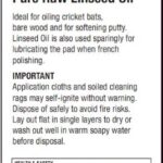 RAW LINSEED OIL – A natural nourishing treatment for wood, including cricket bats, and as a lubricant for french polishing. Also used for softening putty that has become stiff.
