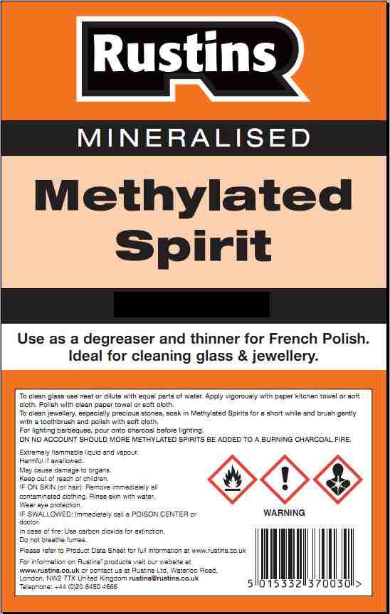 METHYLATED SPIRITS – Used for thinning french polishes and shellac varnishes, for use in spirit burning heaters, stoves and for lighting barbecues. Cleans mirrors, glass and jewellery.