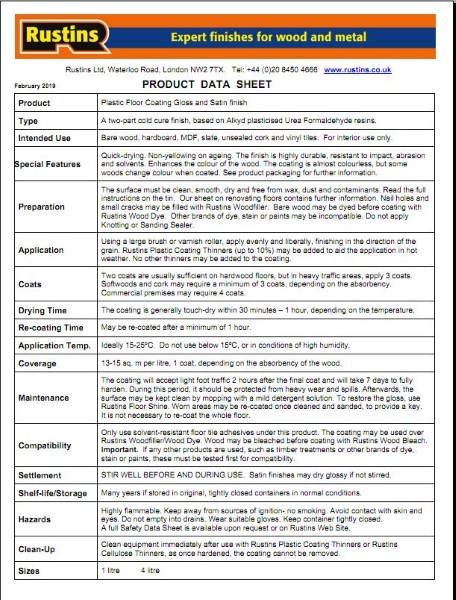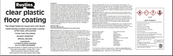 A two-part cold cure lacquer with excellent adhesion and durability. Almost colourless and will not craze or yellow on ageing. Resistant to scratching, abrasion, most solvents, weak acids and alkalis. Can be applied to wood, cork, chipboard, MDF, laminates, slate and stone. Re-coatable after 1-11/2 hours, floor can be used 2 hours after last coat has been applied. Satin finish. Size: 4L pack.