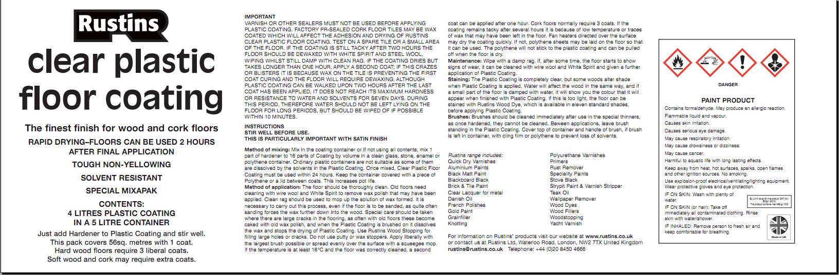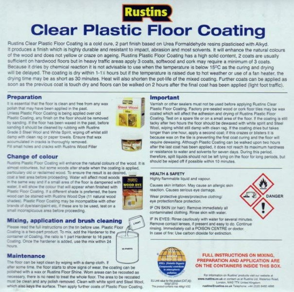 A two-part cold cure lacquer with excellent adhesion and durability. Almost colourless and will not craze or yellow on ageing. Resistant to scratching, abrasion, most solvents, weak acids and alkalis. Can be applied to wood, cork, chipboard, MDF, laminates, slate and stone. Re-coatable after 1-11/2 hours, floor can be used 2 hours after last coat has been applied. Satin finish. Size: 4L pack.