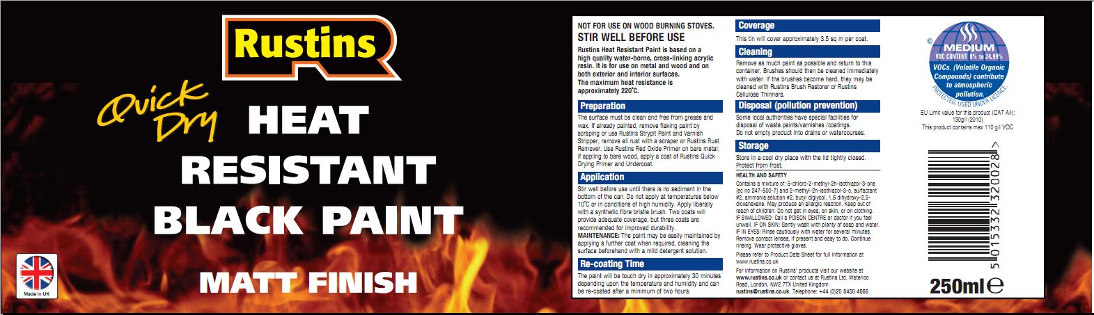 QUICK-DRYING HEAT RESISTANT BLACK PAINT – Rustins Heat Resistant Paint is based on a high quality water-borne, cross-linking acrylic resin. It is a low VOC paint for use on metal and wood and on both exterior and interior surfaces. The maximum heat resistance is approximately 220degC.