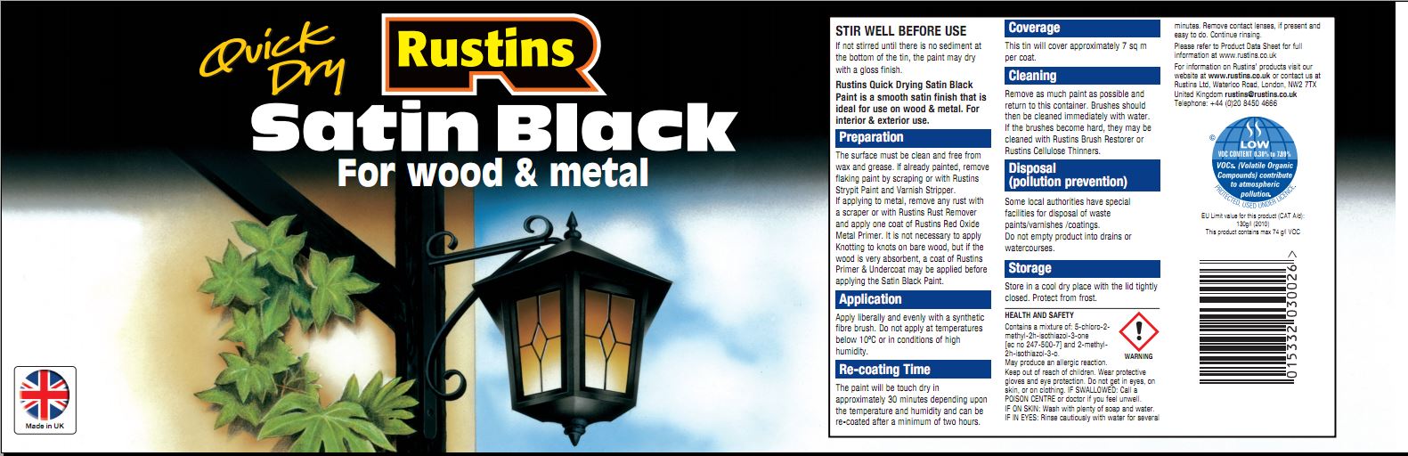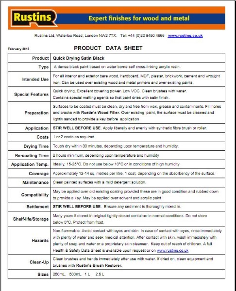 Quick Drying Satin Black Paint produces a smooth satin finish on wood and metal. Suitable for interior and exterior use. Clean brushes in water. 250ml.