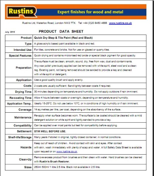 Rustins Quick Dry Step & Tile Gloss Paint is a quick drying high performance interior and exterior paint for use on tiles, concrete and bricks. Not for use on glazed or quarry tiles.