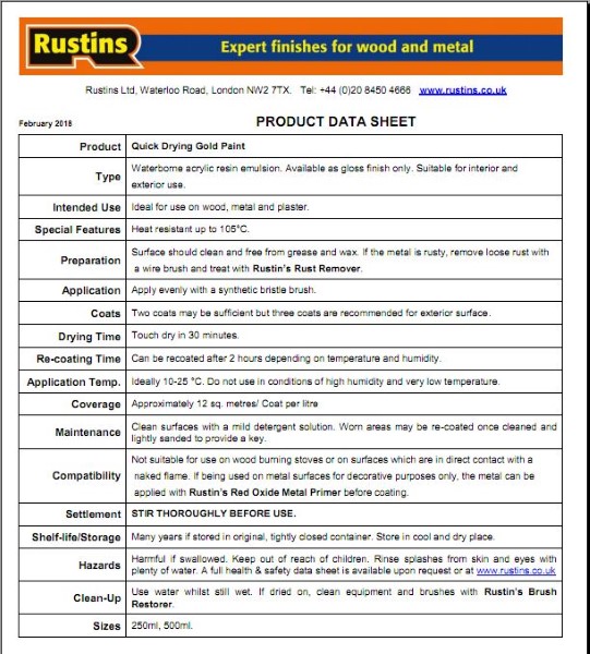 Rustins Quick Drying Gold Paint. Suitable for interior & exterior use. Touch dry in 2 hours. May be applied to wood and metal and over painted surfaces. Clean brushes in water
