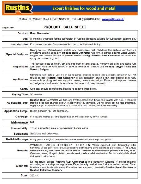 A water based treatment which neutralises rust. It stabilises the surface and forms a protective coating once dry. It seals and primes so no primer is required allowing to topcoat directly. It will form a barrier against water vapour, oxygen and carbon dioxide. Resistant to salt spray and bacterial growth.