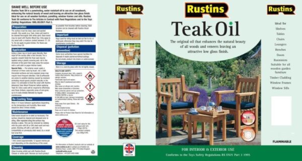 High quality teak oil. Rustins Teak Oil is a special blend for use on unpolished wood surfaces, indoors and outdoors, where the natural oils have been removed by weathering, This teak oil will prevent wood drying, warping and splitting