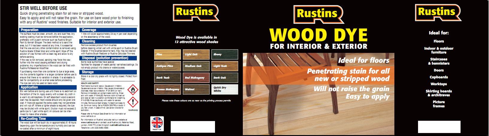 Rustins Wood Dye – For use on bare wood prior to finishing with any of Rustins wood finishes. Quick drying penetrating stain, does not raise the grain. Supplied in 11 shades, which may be intermixed to make an infinite variety of natural wood shades. Ebony finish.