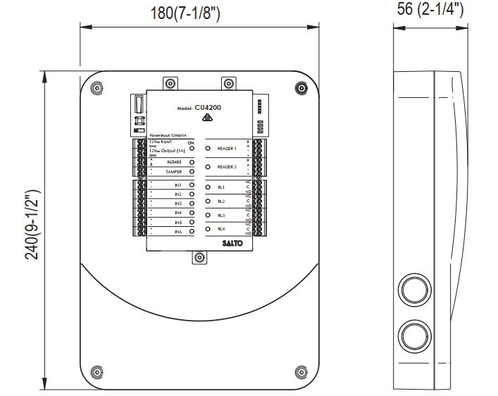 - Door monitoring and tamper monitoring via contacts input (intrusion alarm and door left opened alarm
