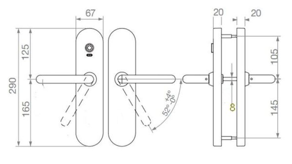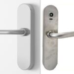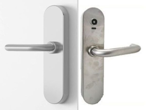 Salto XS4 Wide iButton Contact RW Access Control Lockset. 67mm Backplates. Outer handle with clutch. Engages to open with valid fob. Inner handle always free to open. U shaped lever. Satin stainless steel finish. Progammable via software. Use with Lock-Tech auto deadlocking mortice nightlatch. Door thickness 45-60mm.