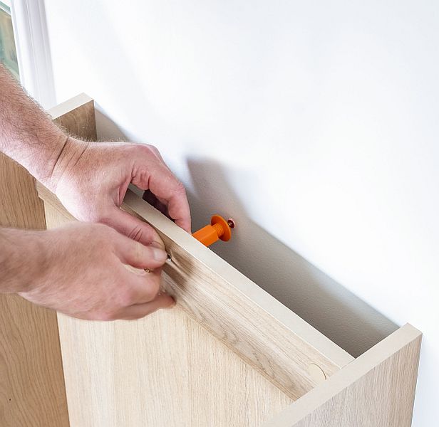 A simple method to secure units to the wall. Bridges any reasonable gap.
