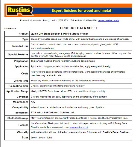 A water based matt white stain blocker for interior and exterior use, with excellent adhesion to wood, plaster and previously painted surfaces. It will seal all stains that may bleed through and discolour paint. As a primer, it provides excellent adhesion to ceramic tiles, glass, and melamine.