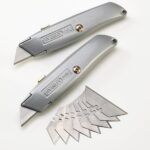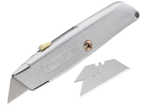 The Stanley 99E Original Retractable Blade Knife is made from grey painted die-cast metal body, which is ergonomically shaped for a comfortable grip. The blade extension can be controlled by the blade shifter with 5 blade positions for a wider range of cutting applications. The interlock nose firmly secures the blade into knife. For safety, the blade can be fully retracted into the body.