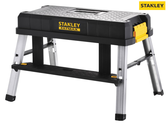 The Stanley Tools FatMax Work Step Toolbox combines a toolbox and work step in one. It has a lightweight design with an ergonomic carry handle for easy carrying. The work step has stainless aluminium legs with non-slip feet to ensure optimum stability and longevity. For added safety the step has been fitted with safety lock buttons.