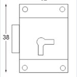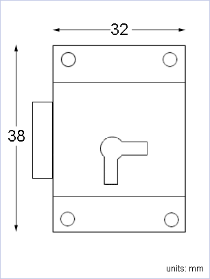 One lever. Size of plate: 38x32mm (1.5×1.1/4 inches). Dist. to pin: 13mm (1/2 inch). 1 key.