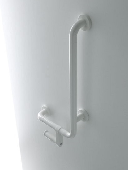 Right angle-shaped toilet roll holder.