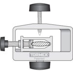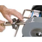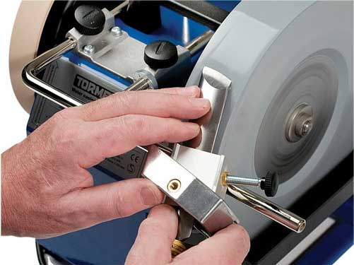 This is a very comprehensive Tormek jig which can be used equally well for turning and carving tools. There are two holders provided, one for turners skew chisels, either oval or square section, from 13mm to 35mm wide, and the other for carvers skew chisels, parting tools, roughing gouges and wide carving gouges up to 50mm wide. The jig is clamped to the tool and the angle is set by re-positioning the universal support in the horizontal base.