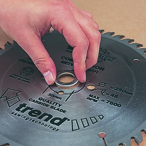 Accurately machined with reamed bores and splined outside edges for a precision fit into the blade bore of Trend Waveform sawblades only.Extra care must be taken when mounting sawblades onto a saw spindle when using bushing washers.Only for use with Trend Waveform & Industrial Sawblades. Loose bushing washers/rings must not be used.