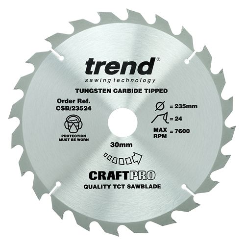 Craft saw blade 235mm x 24 teeth x 30mm bore. A range of Tungsten Carbide Tipped Circular Sawblades designed for a professional finish in soft wood, hard wood, exotic rip, plasterboard, stone fibre board and particle board.