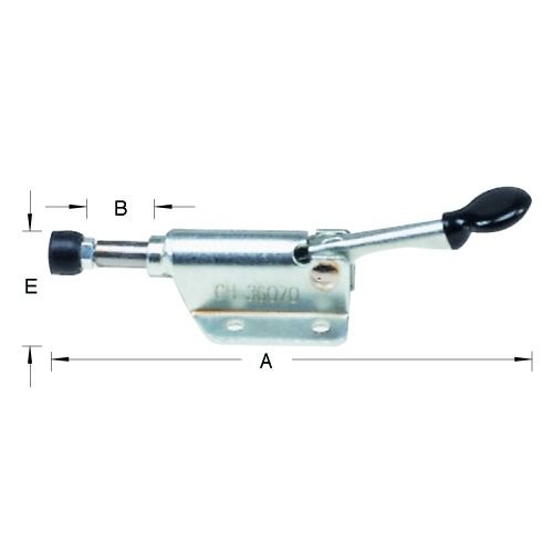 Ideal for securing workpiece against a back stop on a jig. Force=150kg E=23mm A=126mm B=11mm.