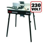 Professional portable router table with aluminium table surface and back fence for floor & bench mounting use. Back fence squareness adjustment for absolute accuracy. T11E quick release fixing holes for fixing T11 fixing kit. Bench leg level adjustment when mounted on a bench. 20mm hole for the T11 Quick Raiser adjuster handle.