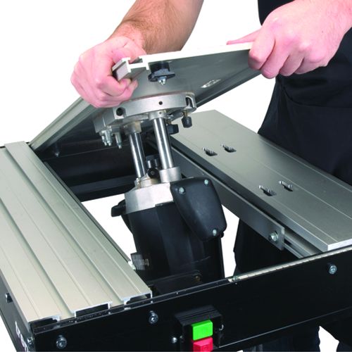 Extruded 8mm thick aluminium alloy table top with minimal loss of cutter depth. Cutter aperture of 90mm allows use of the largest router cutters available.