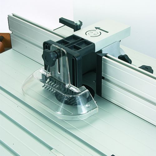 Cast back fence with extruded adjustable alloy cheeks and T slots. Made to EN standards, with back fence accuracy of 0.5 degree & table flatness of 0.5mm.