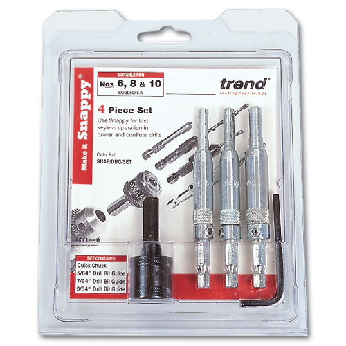 One set comprising a Quick Chuck and three sizes of Drill Bit Guides for the accurate fitting of hinges. Shank Diameter=1/4 inch hex. Includes 1 x Quick chuck|1 x Drill bit guide 5/64in|1 x Drill bit guide 7/64in|1 x Drill bit guide 9/64in