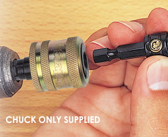 This is fitted into a standard 3/8 inch key or keyless chuck. Snappy attachments or any direct drive 1/4 inch hex bits can then snap in effortlessly.Six flats on the shank ensure precise location in the chuck.A spring loaded outer sleeve makes it easy to remove attachments.Patent No. US5,398,946.