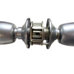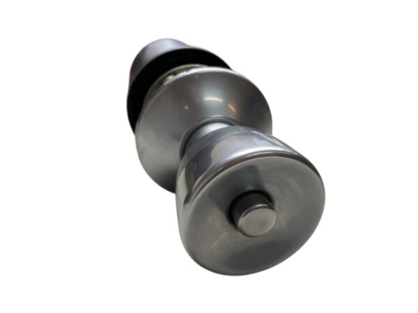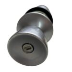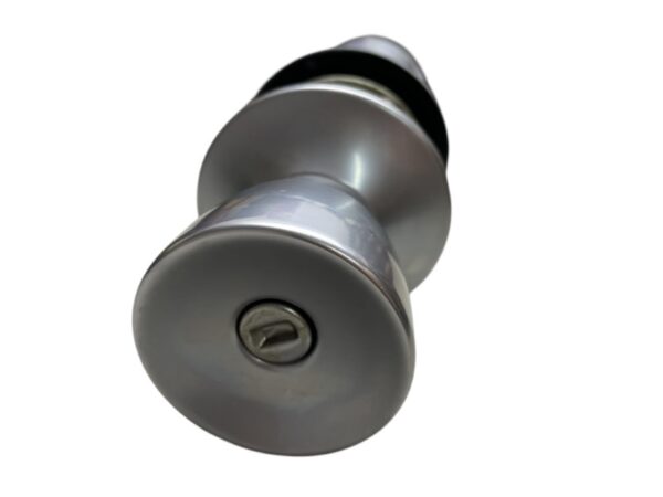 Pushbutton Set. Latch bolt withdrawn by either knob, except when outside knob is locked by pushbutton in inside knob. Outside knob remains locked until pushbutton is released, either by turning inside knob or by operating emergency release by slotted button in outside knob. Inside knob always free to turn. Plain latch supplied N.B. This set incorporates a “slam release” feature to avoid accidental lockout. (If the locking pushbutton in the inside knob is applied when the door is standing open it is automatically released when the door is closed and the latch bolt strikes the striking plate)