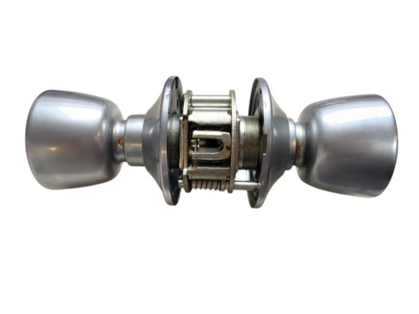 Pushbutton Set. Latch bolt withdrawn by either knob, except when outside knob is locked by pushbutton in inside knob. Outside knob remains locked until pushbutton is released, either by turning inside knob or by operating emergency release by slotted button in outside knob. Inside knob always free to turn. Plain latch supplied N.B. This set incorporates a “slam release” feature to avoid accidental lockout. (If the locking pushbutton in the inside knob is applied when the door is standing open it is automatically released when the door is closed and the latch bolt strikes the striking plate)