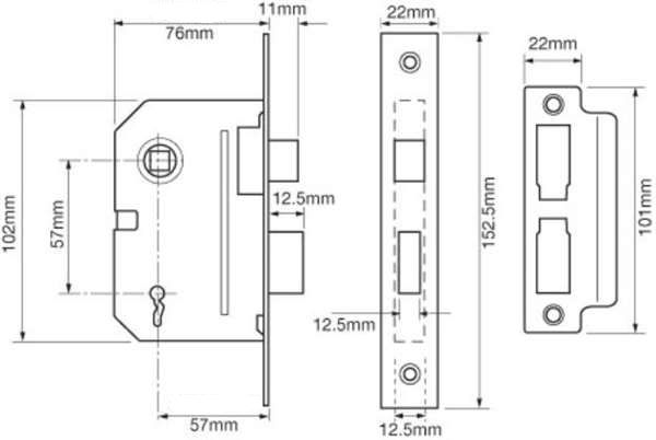 Two way action suitable for lightway knobs or sprung handles. Deadbolt locked or unlocked by key from either side. Latchbolt withdrawn by lever handle from either side. Keys suitable for doors upto 55mm thick when using 8mm thick furniture plates.