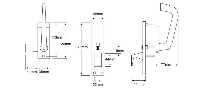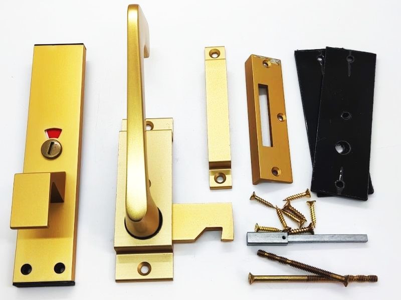 Indicator bolt (facility) left hand. Anodised gold. Complies with Doc M. Suitable for hinged or sliding doors. Surface mount. (Door hinge on left from inside). Can be re-handed by circlip removal and re-fit. Complete with mortice and surface keeps. Internal lever can be restricted to 30 or 90 degrees. External pull can be positioned at 0, 90, 180, or 270 degrees.