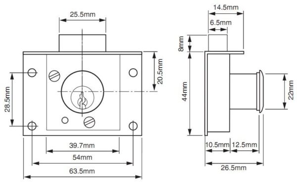 Drawer Lock Cut Cylinder Pattern 63mm Brass.