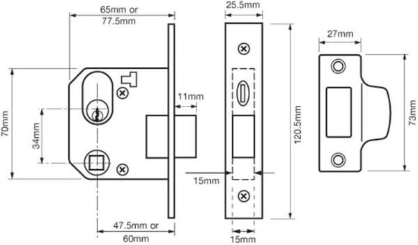 Latchbolt withdrawn by cylinder key from outside. Latchbolt withdrawn by separate turn snib from inside (i.e. UNI5203). Bolt held in the withdrawn position by use of optional snib in the forend.