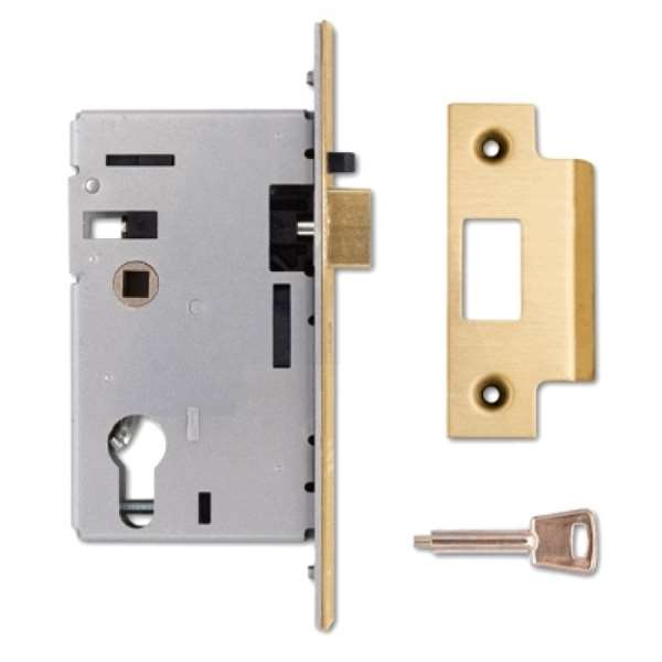 Latchbolt withdrawn by cylinder from outside and by sprung lever handle or separate turn snib from inside. Bolt easily reversible. Anti-thrust slide protects bolt against and pressure effective at door gaps up to 6mm. Bolt held in the withdrawn position by use of special key.