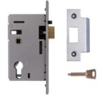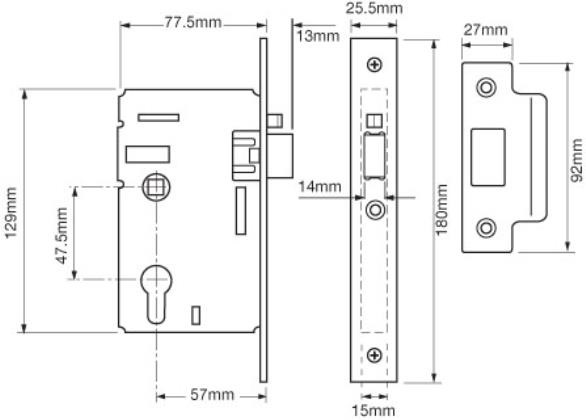 Latch bolt withdrawn by euro profile cylinder from outside and sprung lever handle or separate turn from inside