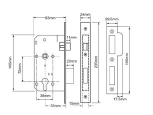 MORTICE SASHLOCK EURO 72mm CC DIN CASE 55mm BACKSET 83mm CASE DEPTH SS