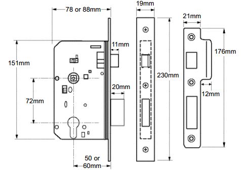 Mortice escape lock for wooden doors hinged on the left or right. European style casing which accommodates most euro-profile cylinders. Latch bolt withdrawn by lever handle from inside or lever handle or key from outside. Deadbolt withdrawn by key from outside. Dead and latch bolt withdrawn simultaneously by inside lever handle. Double throw – 20mm throw when key is turned twice. Lock is fully reversible. Pierced to accept bolt through furniture and security rose. 60mm backset. 72mm centres. Case only. Square forend. Satin stainles steel finish. Complete with Split Spindle. Requires pair Levers and Euro Cylinder (Double or Key & Turn)