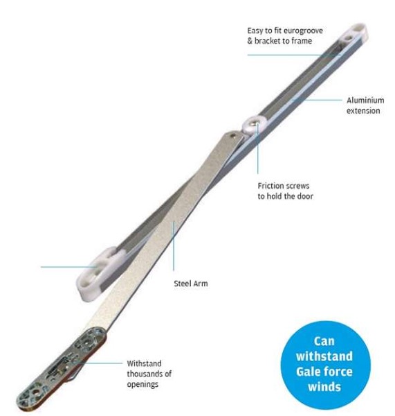 This restrictor limits door opening to a preset position, or to a maximum of 90 degrees, and includes an easy-to-fit eurogroove and bracket to frame. Our Door Stay is perfectly suitable for all major uPVC profiles, and measures 335mm in length. It can withstand literally thousands upon thousands of openings without becoming damaged, and does not become affected by daily wear and tear. Additionally, a carefully constructed slider contains special friction screws to hold the door open in mild wind conditions, so that it remains stable and steady.